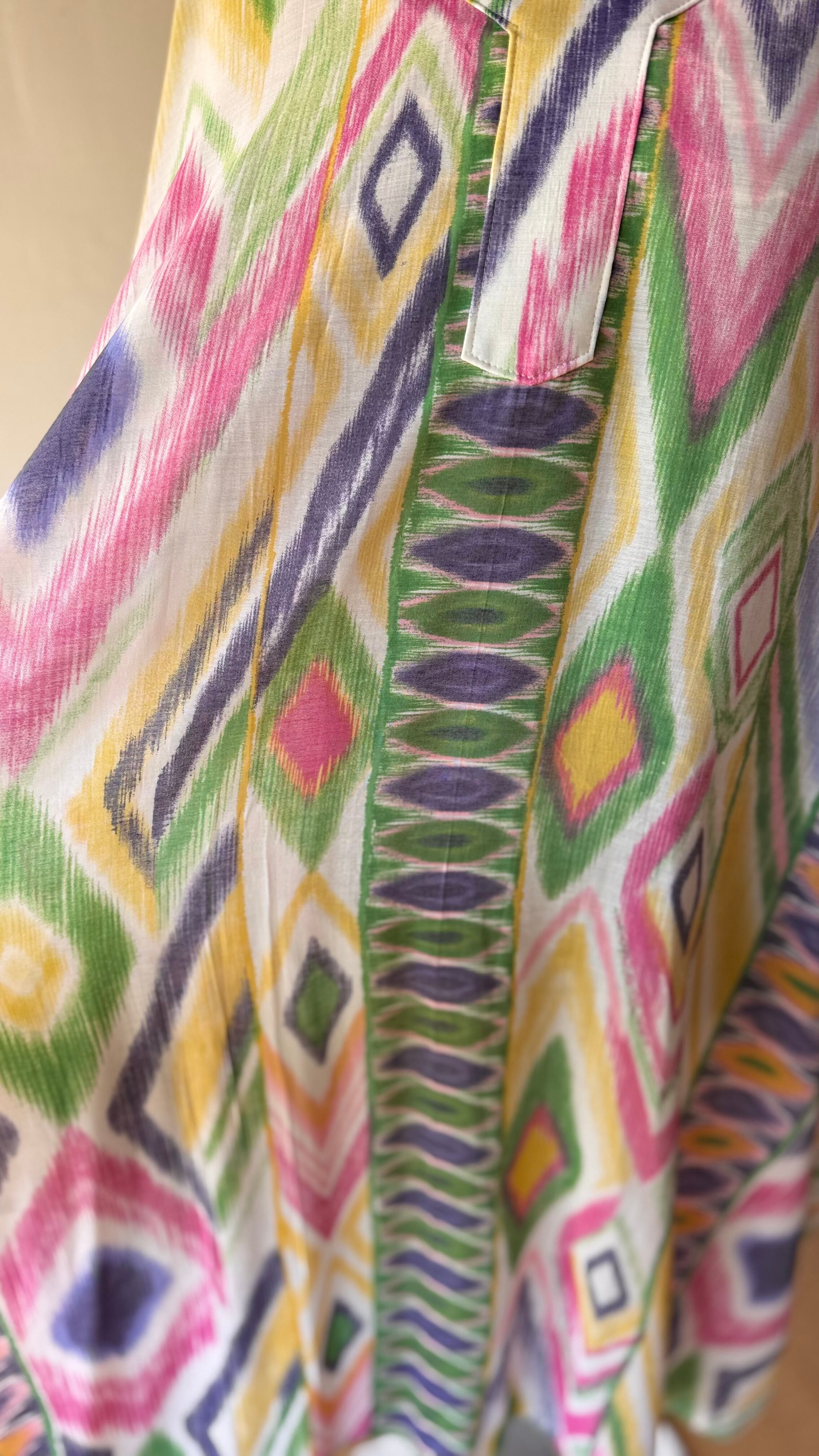 ゆったりとしたシルエットで動きやすく、両サイドには便利なポケットが付いているのが嬉しいポイントです!軽くて透け感のあるレーヨン素材で、特別なコーディネートにも、普段使いとしても大活躍します。